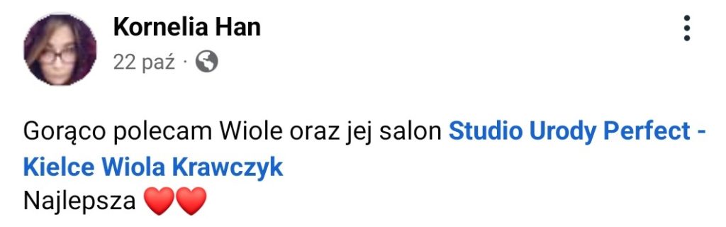 Dzięki pozytywnym opiniom zadowolonych klientek wiem, że Studio Urody Perfect to najlepsze miejsce dla wszystkich, którzy chcą zadbać o swoje ciało i duszę.
